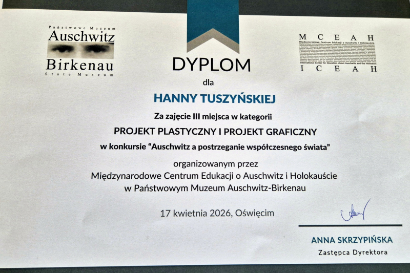 Uczennica klasy 8a - Hanna Tuszyńska, zdobyła III miejsce w ogólnopolskim konkursie historycznym „Auschwitz, a postrzeganie współczesnego świata”. Nagrodzona praca pt. „Nigdy więcej obojętności” została wysoko oceniona przez jury konkursu, zorganizowanego przez Międzynarodowe Centrum Edukacji o Auschwitz i Holokauście przy Państwowym Muzeum Auschwitz-Birkenau.