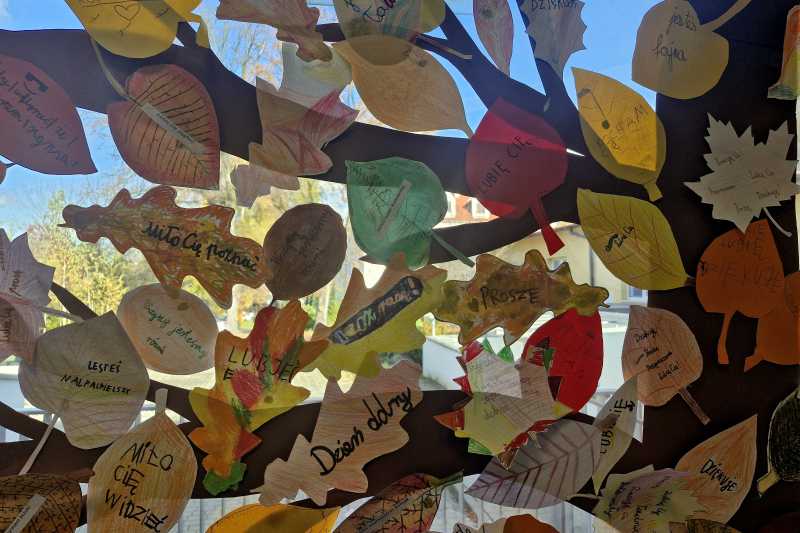 W klasach wychowawcy przeprowadzili rozmowy z uczniami na temat dobrej komunikacji. Jako zwieńczenie akcji w tym miesiącu powstało Drzewo Dobrego Słowa. Uczniowie na jesiennych liściach wpisali słowa i zdania, które według nich sprzyjają komunikacji w szkole. Drzewo ozdabia korytarz i inspiruje teraz uczniów, nauczycieli i rodziców!